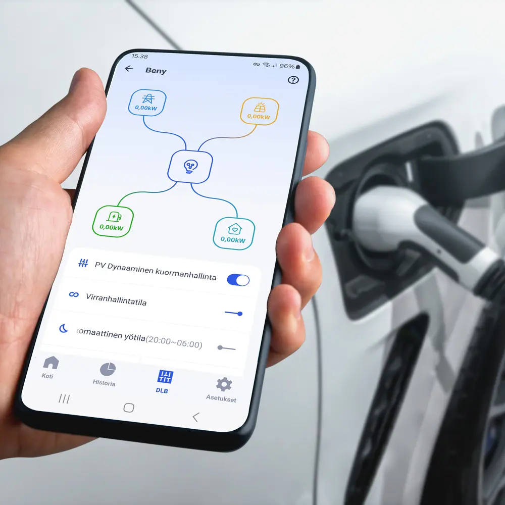 Näin voit huolettomasti käyttää kodinkoneita tai kiuasta ilman, että sinun pitää huolehtia sulakkeiden riittävyydestä. Latauslaite osaa säätää auton lataustehoa paikallisen aurinkosähkön tuotannon mukaisesti.